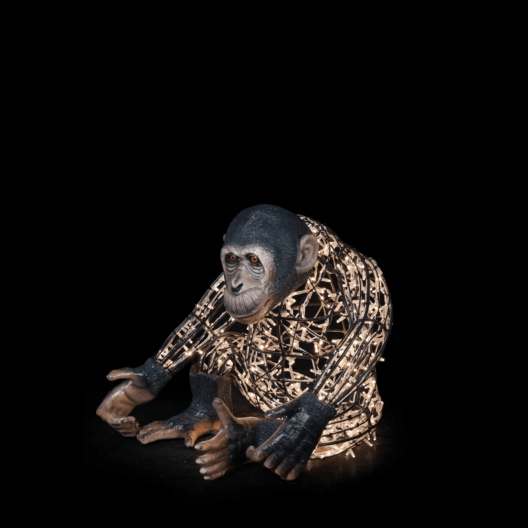 This large illuminated monkey is part of InLiteFi’s monkey family. Made of a durable metal frame, warm white LED lights, and fiberglass accents.