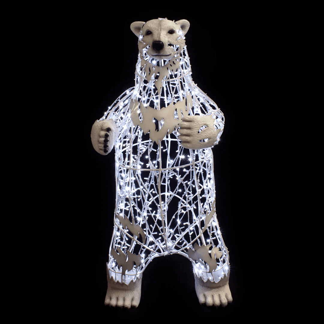 This gorgeously captivating polar bear is part of our polar bear family collection. A heavy metal frame, fiberglass accents, and bright LED lights captures the feeling of an artic breeze with a hint of holiday magic.
