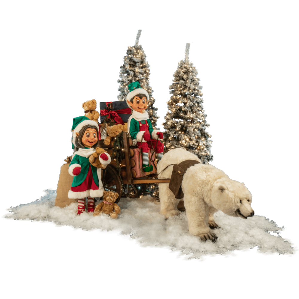 This magical scene includes two animatronic elves, one animatronic polar bear, and one wooden cart with presents.