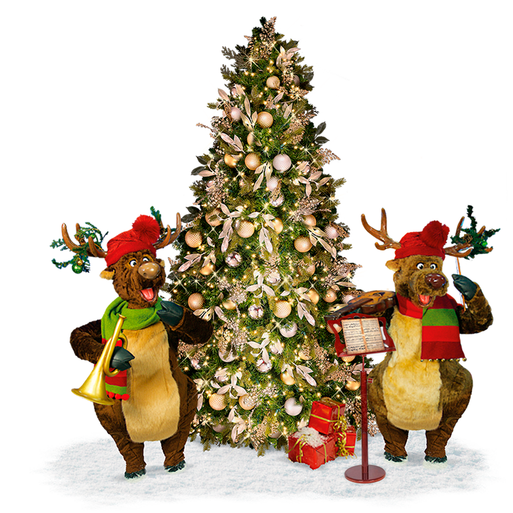 This small scene includes two animatronic reindeer and a sound system. The synchronized reindeer move to the music.