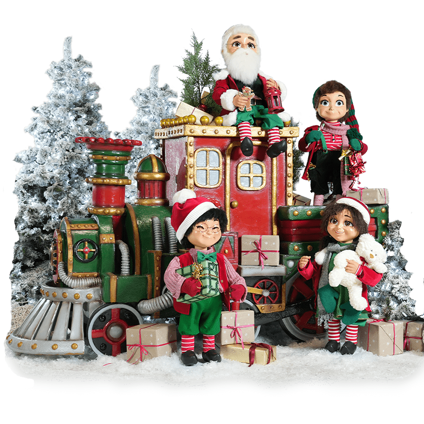 This scene includes one giant fiberglass Christmas train, and four animatronic elves. Trees and gifts sold separately.