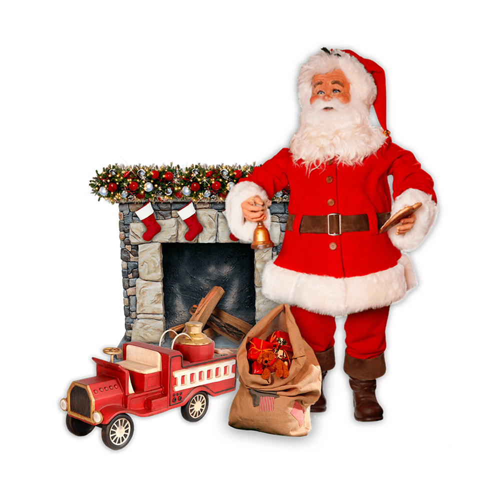 This scene includes one life size Santa Claus animatronic, one firetruck prop, and one fireplace with garland.