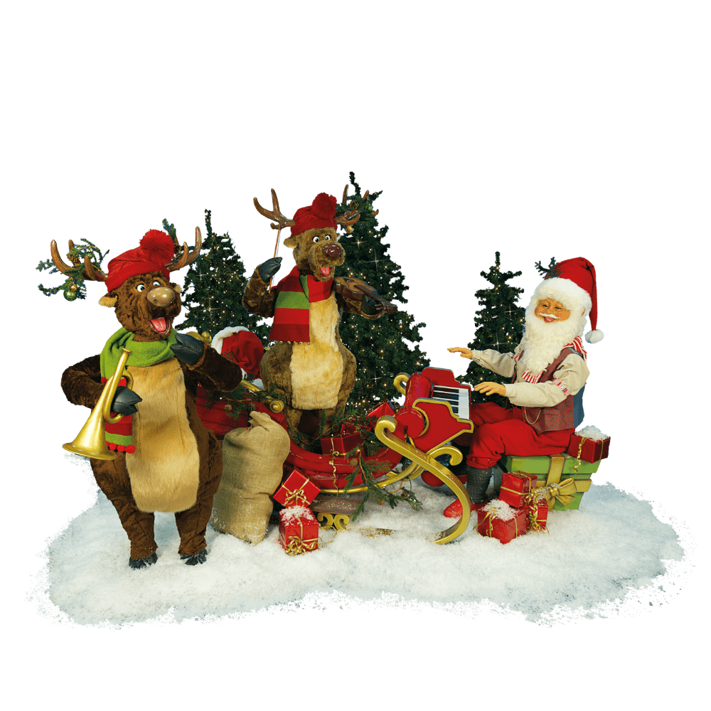 This scene includes two animatronic reindeer, one animatronic Santa, musical instruments, a piano, and a sound system.