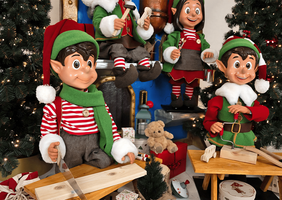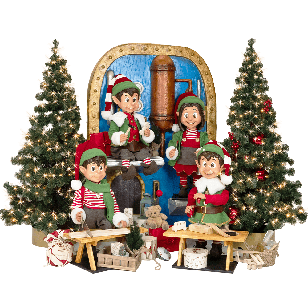 This animatronic scene includes four animatronic figures and one fiberglass toy machine. Trees and additional props are sold separately.