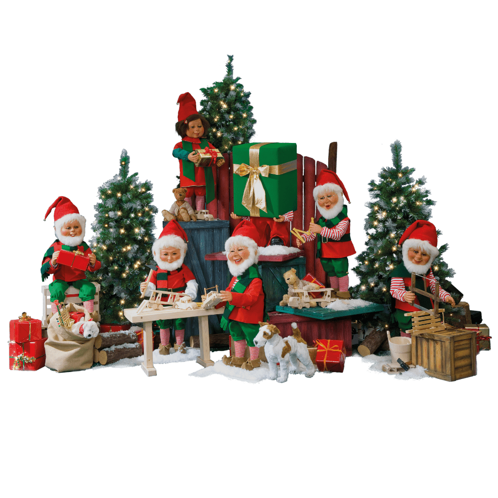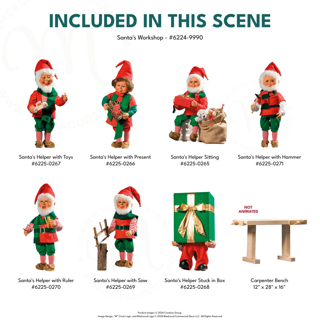 This scene includes seven animatronic elves and a carpenter’s bench. Trees, props, and dog figure are sold separately.