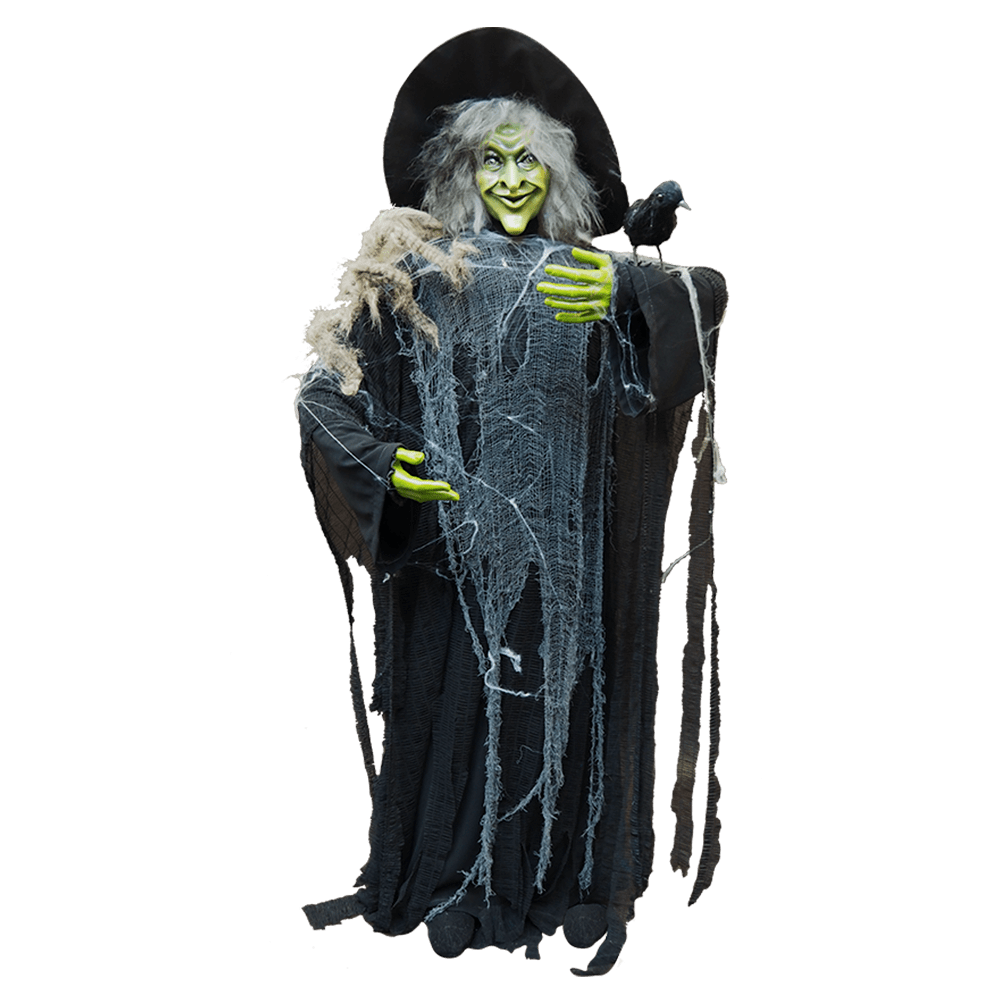 Wanda’s terrifyingly life size stature and haunting laugh will send chills down the spines of your mortal guests. This animatronic witch has a a built-in loudspeaker and plays a creepy laugh. Wanda moves her whole body from side to side, he head up and down, and her right arm from side to side.