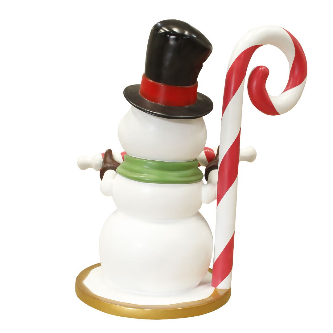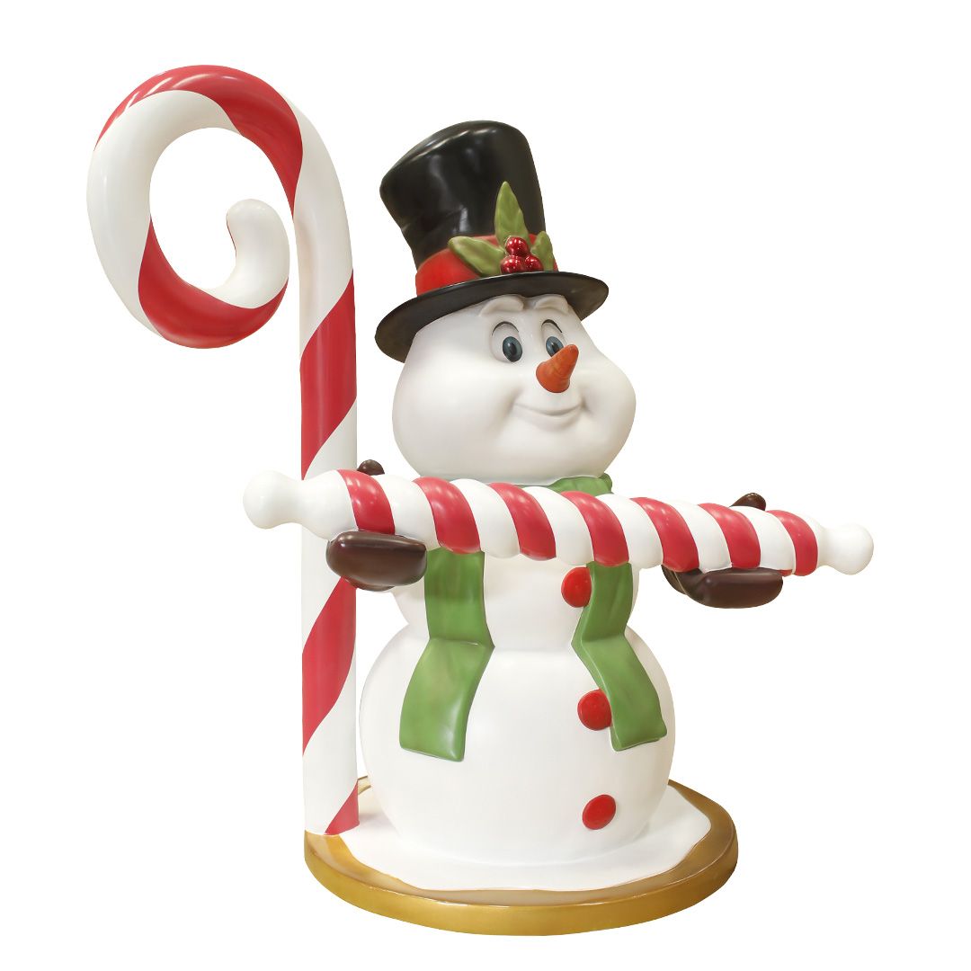 This friendly, festive snowman will surely bring a smile to the faces of children young and old. Handing out candy canes for all to enjoy, this fiberglass snowman is suitable for interior and exterior displays.