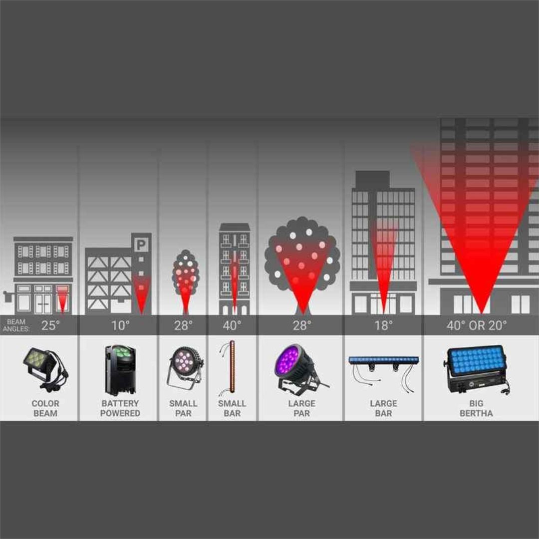 This small LED par light from S4 Lights® is perfect for uplighting trees or small facades. Includes a power adapter wire, and a stand. Measures 11.81 inches in diameter.