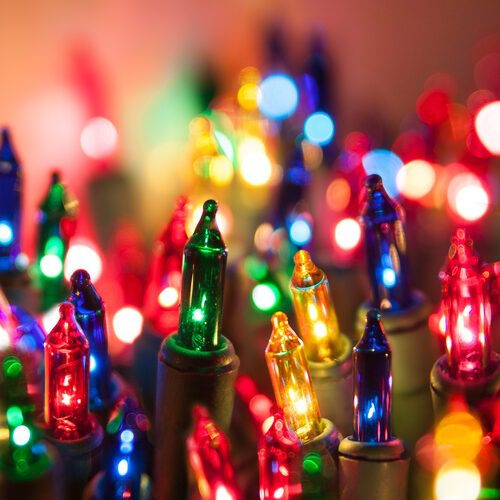 A fan of five multi incandescent mini Christmas lights on green bases.